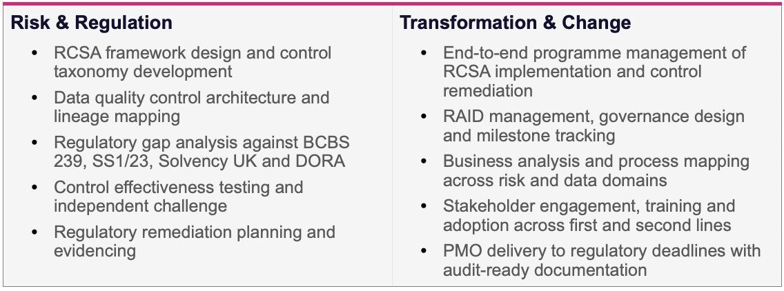 Delta Capita brings together two practices that are too often engaged separately: Risk & Regulation, and Transformation & Change. In our experience, this is precisely where RCSA and control remediation programmes fail; the regulatory design is sound, but the delivery infrastructure is insufficient to drive change at the pace and consistency regulators expect.