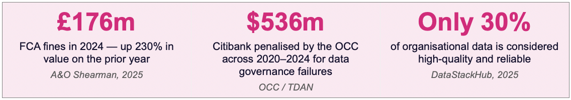 It’s a hot topic with the regulators. The FCA's enforcement activity in 2024 reached £176 million in fines, a 230% increase in value on 2023, with governance and controls failings a recurring theme. The Citibank case, which attracted cumulative OCC penalties of over $500 million between 2020 and 2024 for inadequate data governance and insufficient remediation progress, illustrates what institutional under-investment in this area ultimately costs. The PRA's supervisory statement SS1/23 on model risk management and the Basel Committee's long-standing BCBS 239 principles make clear that data governance and risk control frameworks are regulatory requirements, not aspirational standards. For insurers, Solvency UK reform places equivalent demands on data quality underpinning internal models, SCR calculations and the ORSA process.